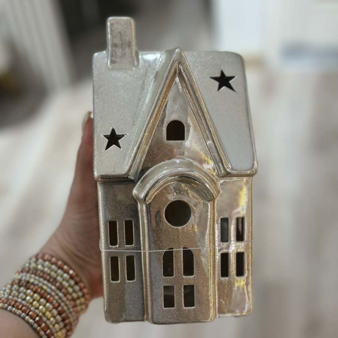 Casita plateada decorativa que captura la esencia festiva de la temporada navideña. Elaborada con acabado plateado brillante, esta pieza añade elegancia y sofisticación a cualquier espacio. Perfecta para crear ambientes navideños memorables, ya sea en vitrinas, mesas de centro o estanterías. Su diseño detallado refleja luz naturalmente, generando un efecto visual cautivador. Ideal para coleccionistas y decoradores que buscan elementos de calidad que trasciendan las temporadas. Un accesorio versátil que complementa tanto estilos clásicos como contemporáneos.