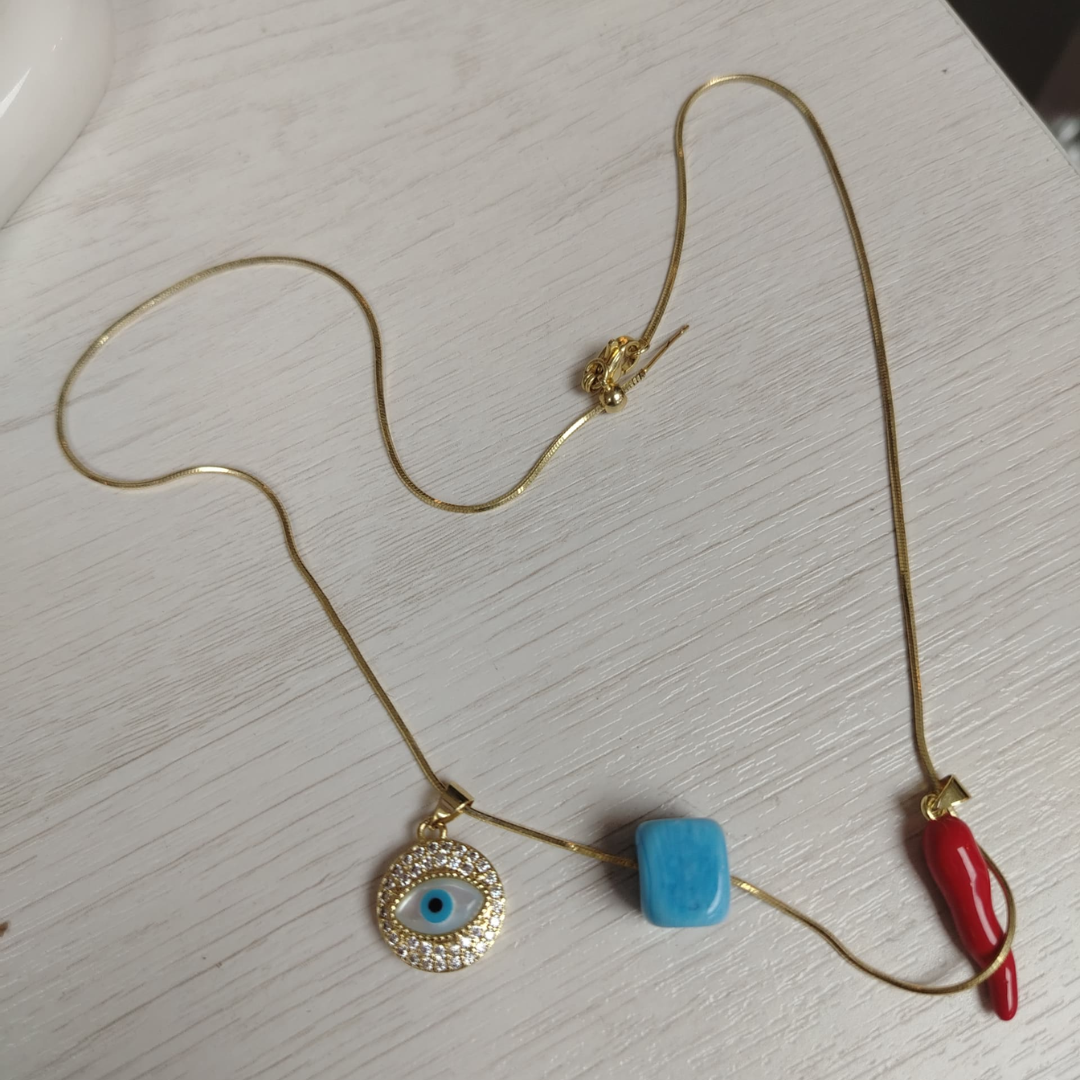 Este collar combina el tradicional Ojo Turco con un cuerno rojo, símbolos reconocidos por su poder protector contra energías negativas. Su diseño experto ofrece un accesorio elegante y significativo, ideal para quienes buscan protección y estilo en una sola pieza. Perfecto para uso diario o como un amuleto especial.