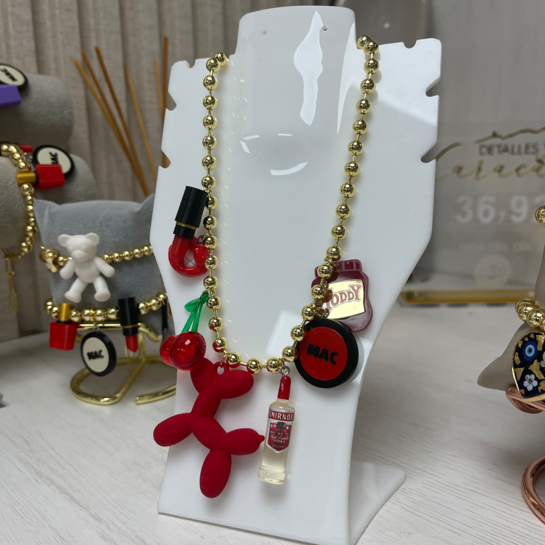 Este collar presenta un diseño único con un perrito rojo acompañado de una cereza, combinando estilo y originalidad. Ideal para quienes buscan un accesorio distintivo que aporte un toque de color y personalidad a su atuendo. Su acabado detallado garantiza durabilidad y un aspecto sofisticado, perfecto para uso diario o como un regalo especial.