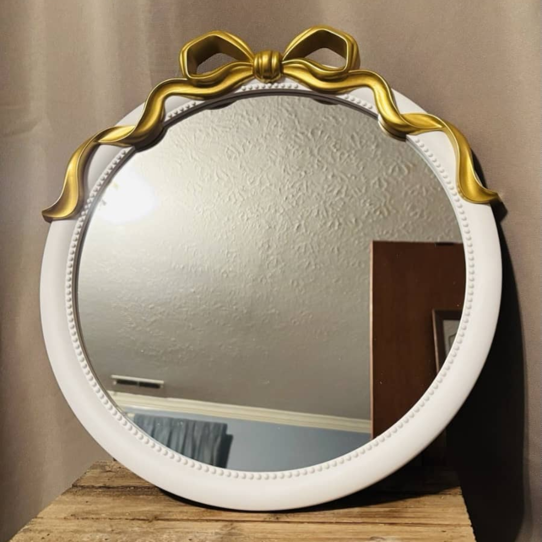 ESPEJO REDONDO CON LAZO DORADO ENCIMA