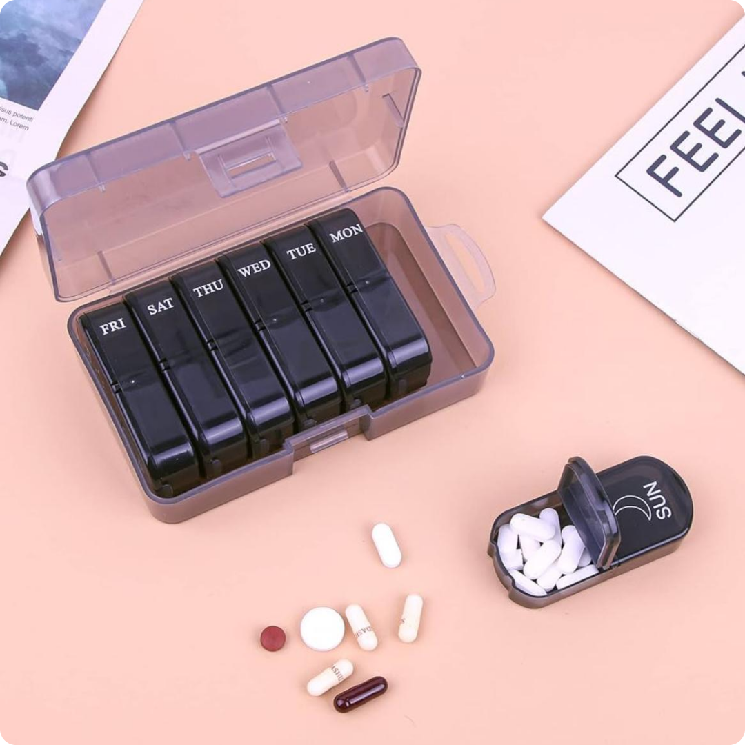 Organice su medicación diaria con este pastillero semanal en color negro, diseñado para separar las dosis de día y noche. Su estructura clara facilita el control y cumplimiento del tratamiento, ayudando a evitar olvidos y errores en la toma de medicamentos. Ideal para quienes requieren una gestión precisa y ordenada de sus pastillas durante toda la semana.